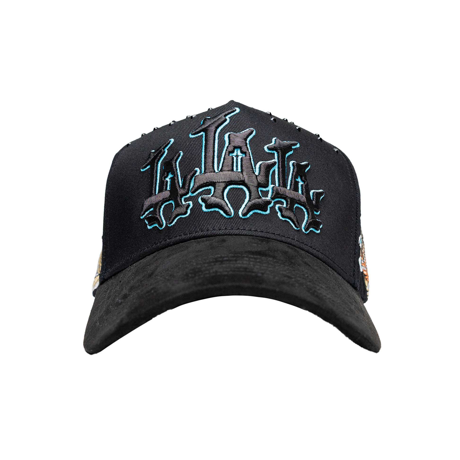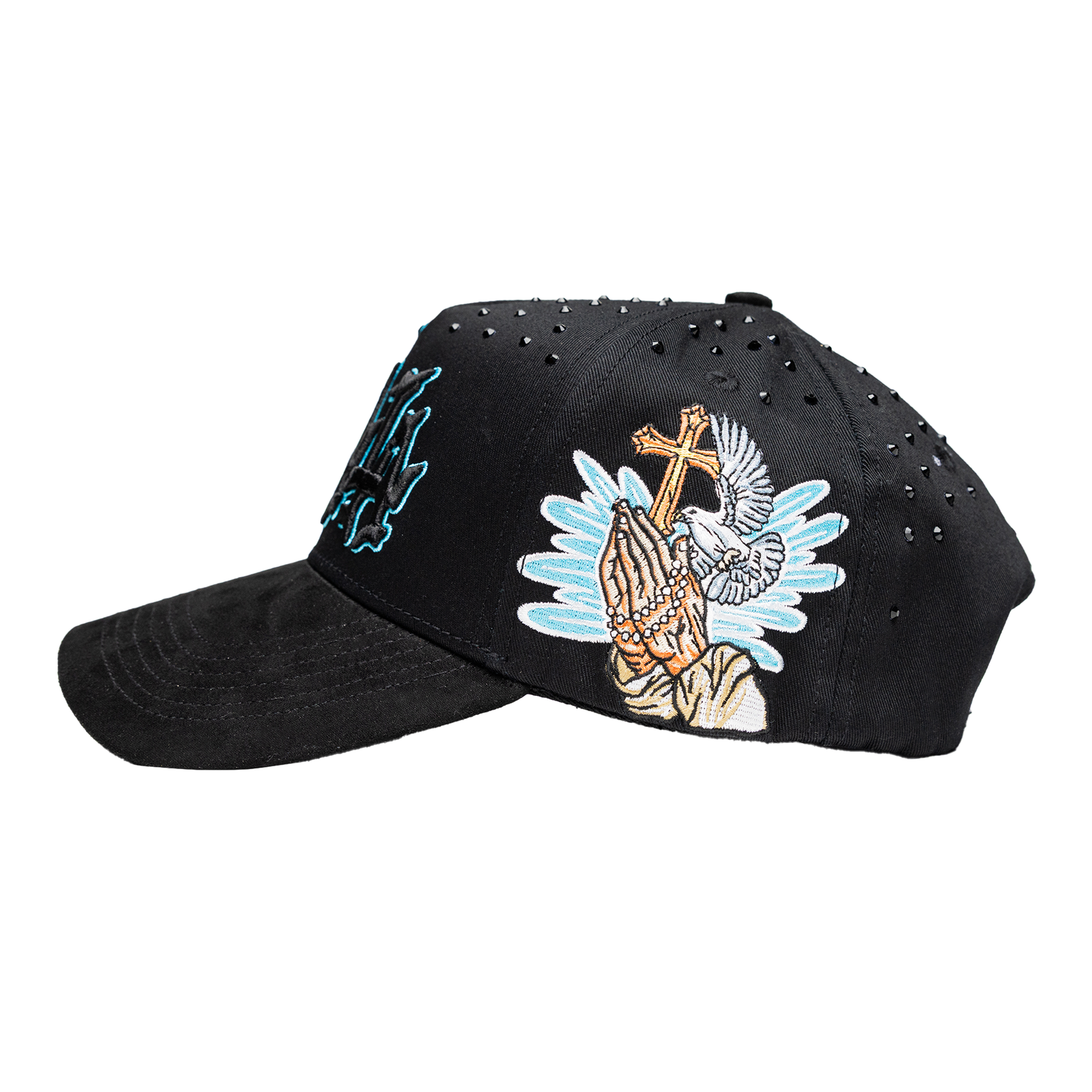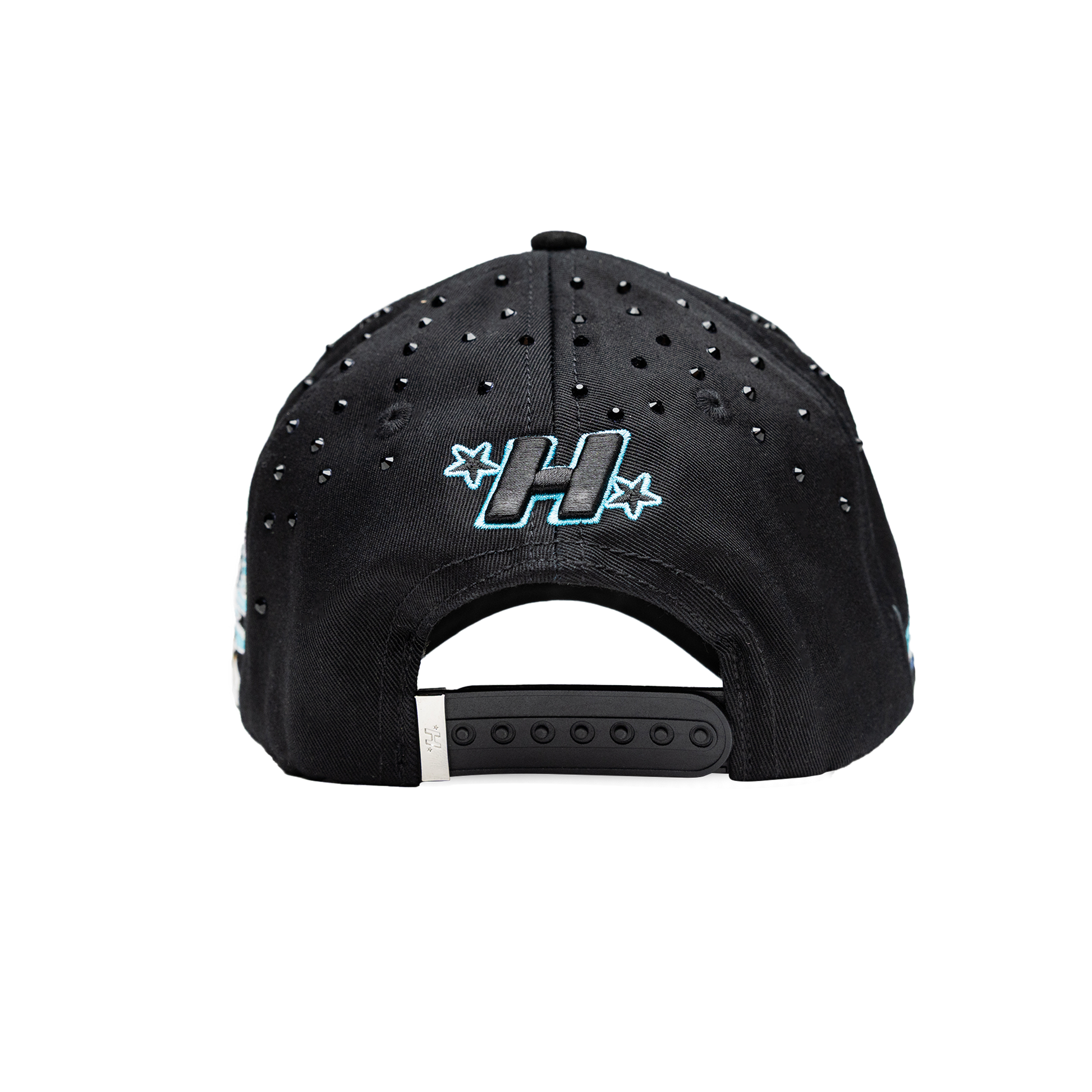 Details: Black in color, gemstones, 3D embroidery, black under visor, black sweatbands