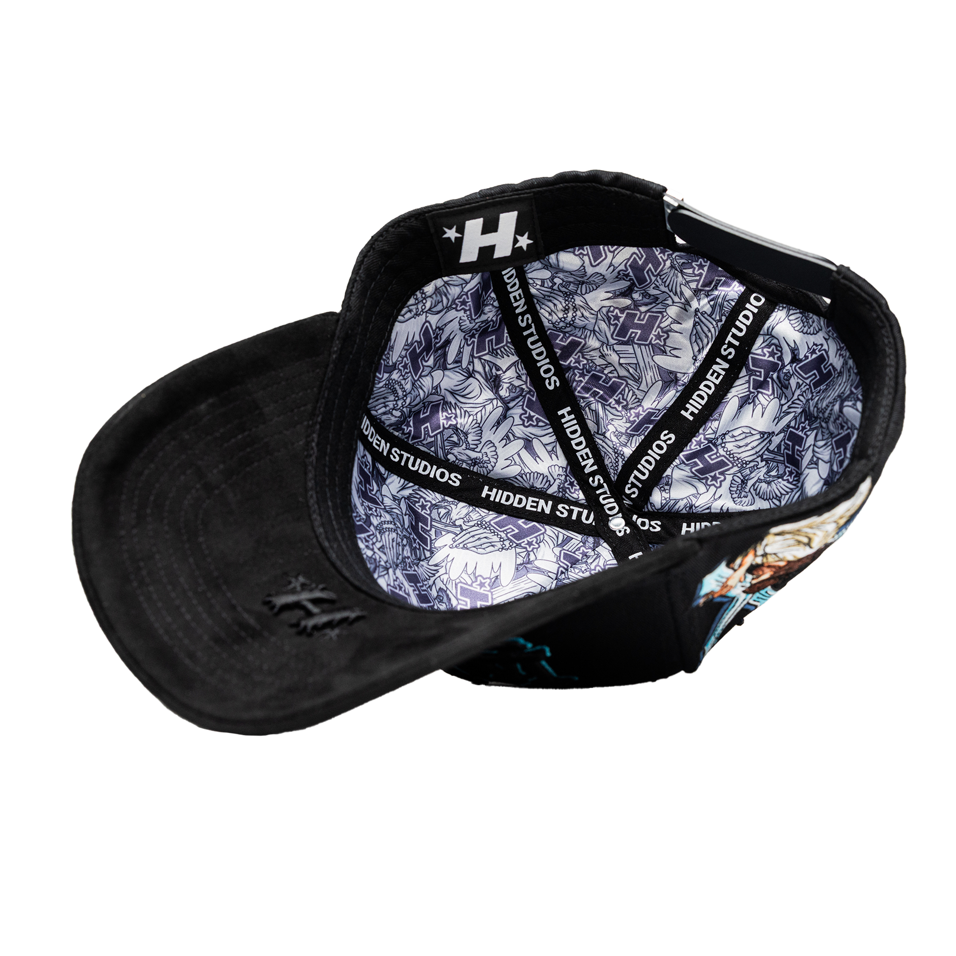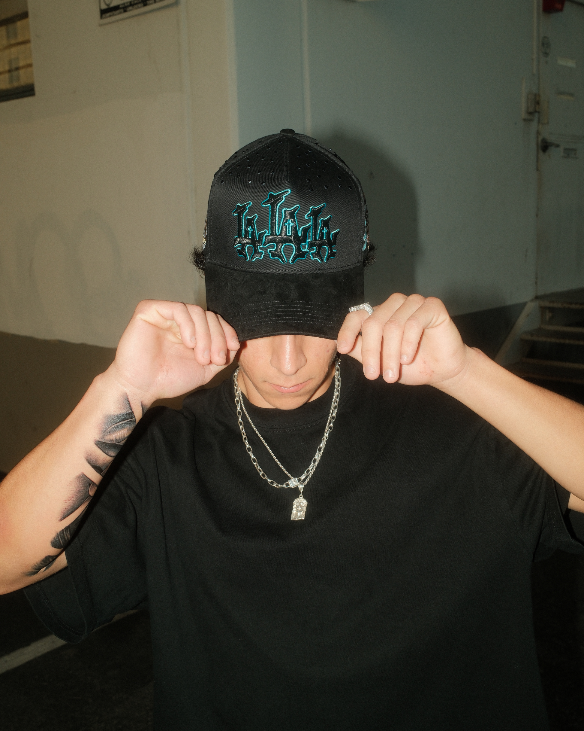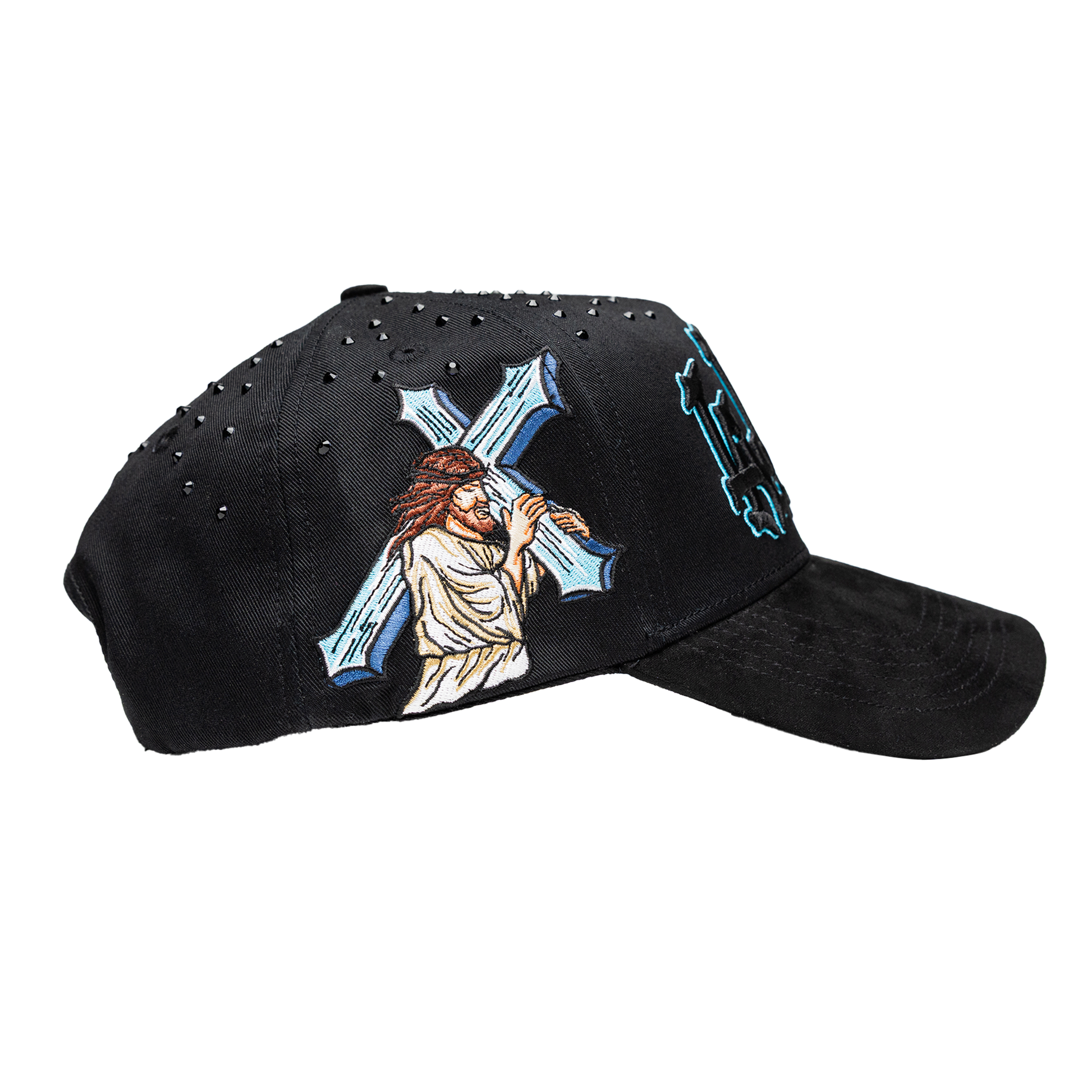 Details: Black in color, gemstones, 3D embroidery, black under visor, black sweatbands