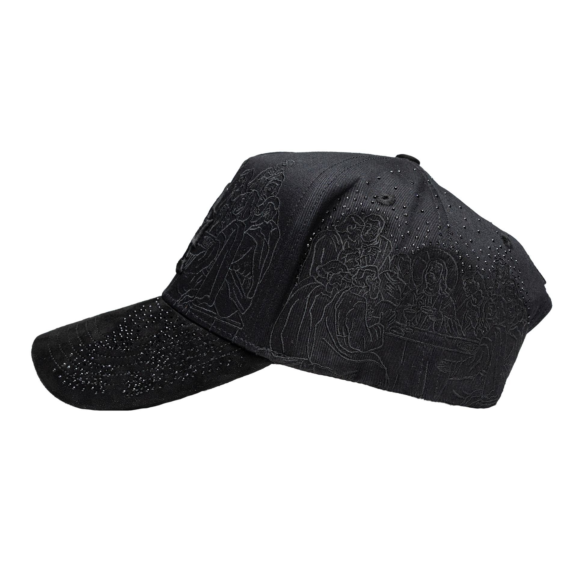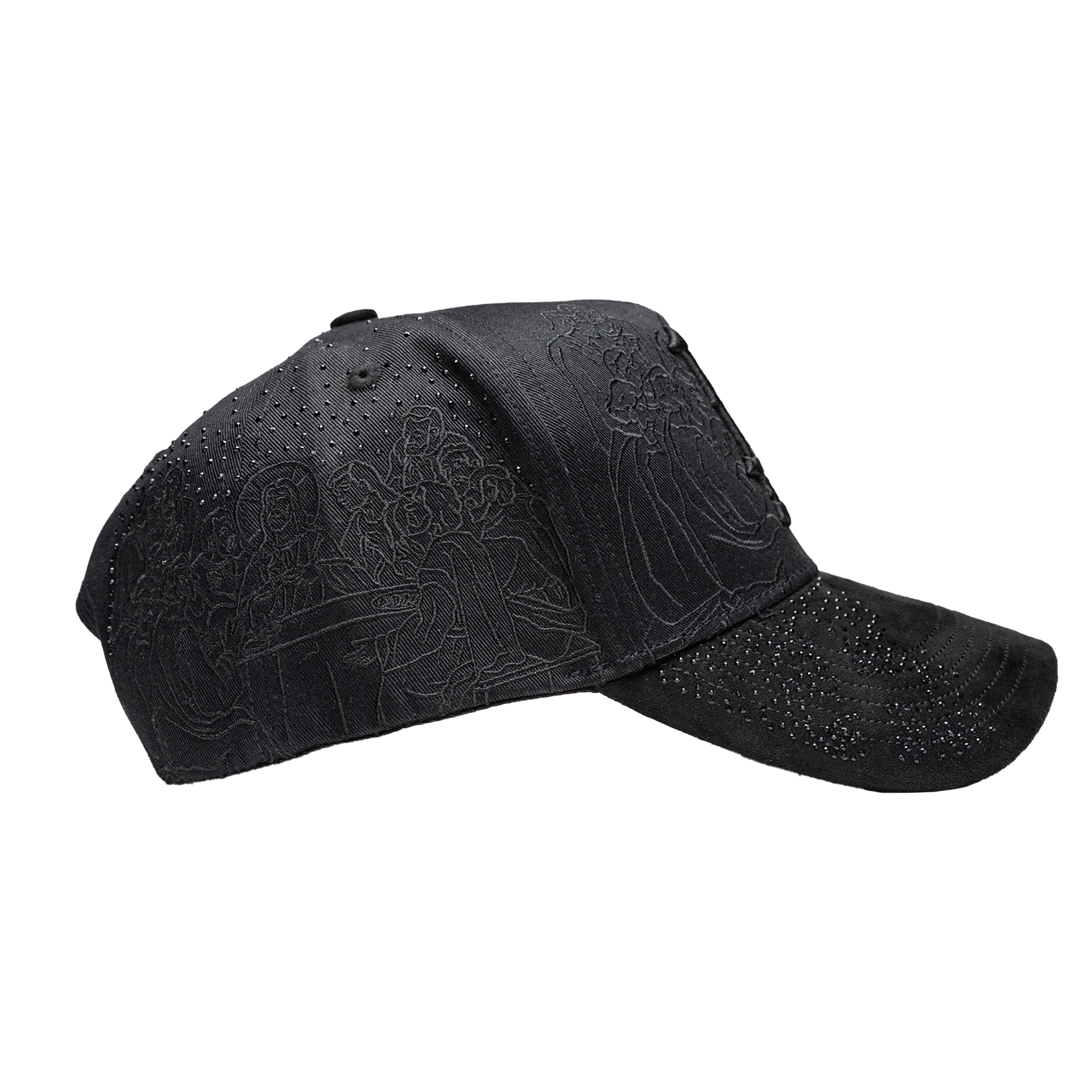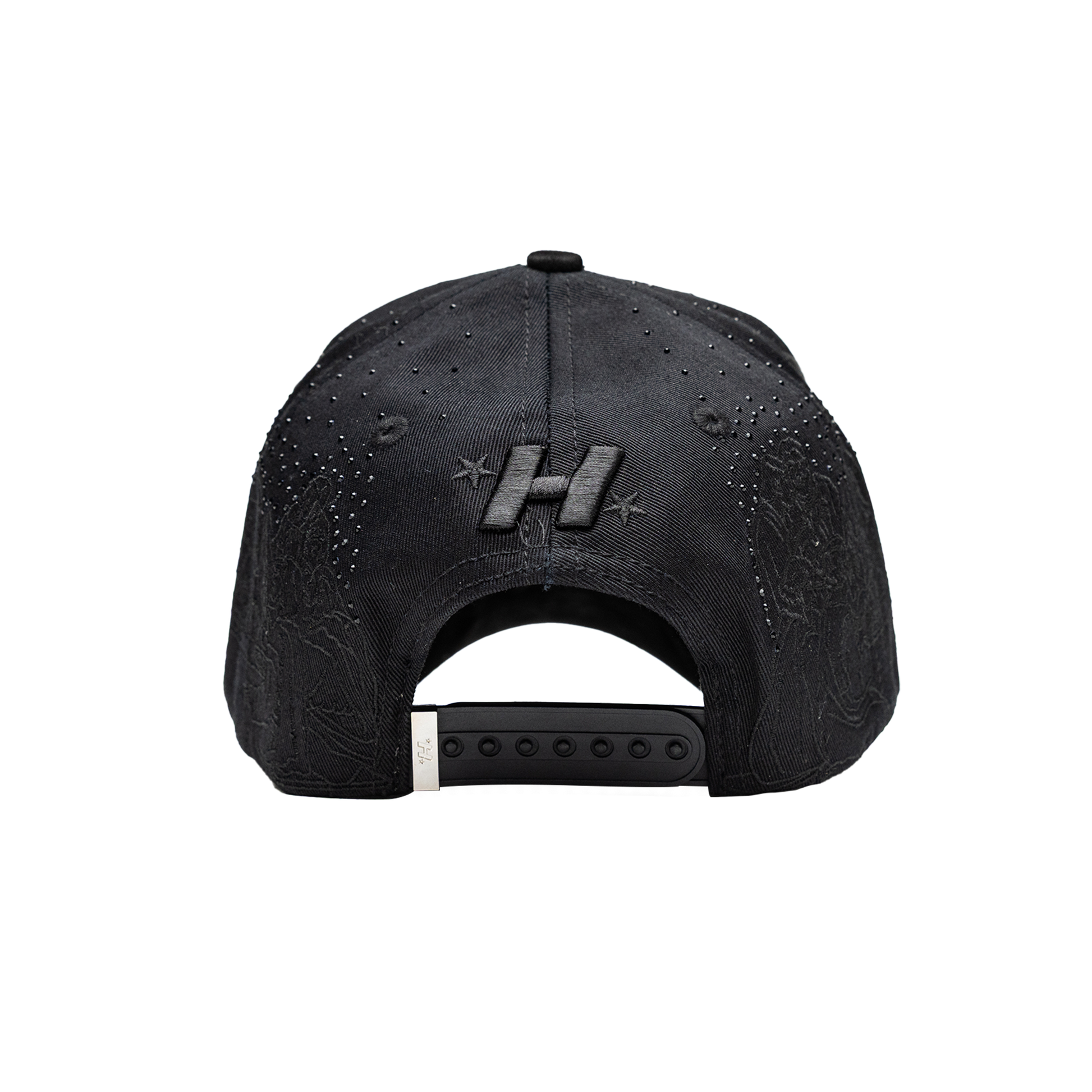 Details: Black in color, gemstones, 3D embroidery, black under visor, black sweatbands