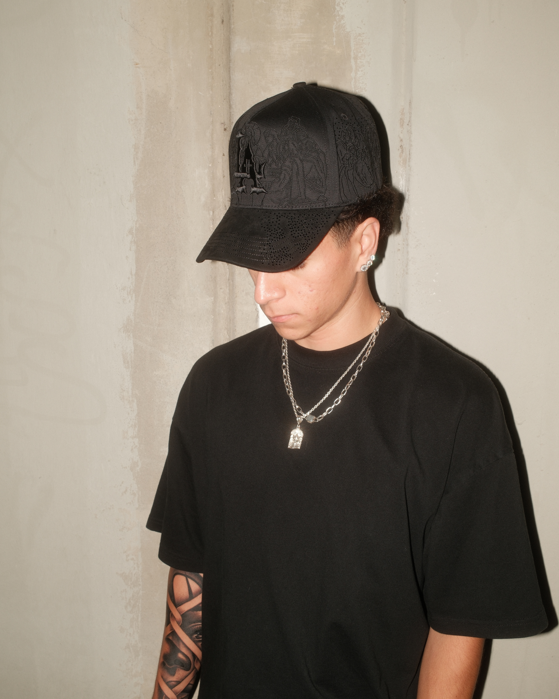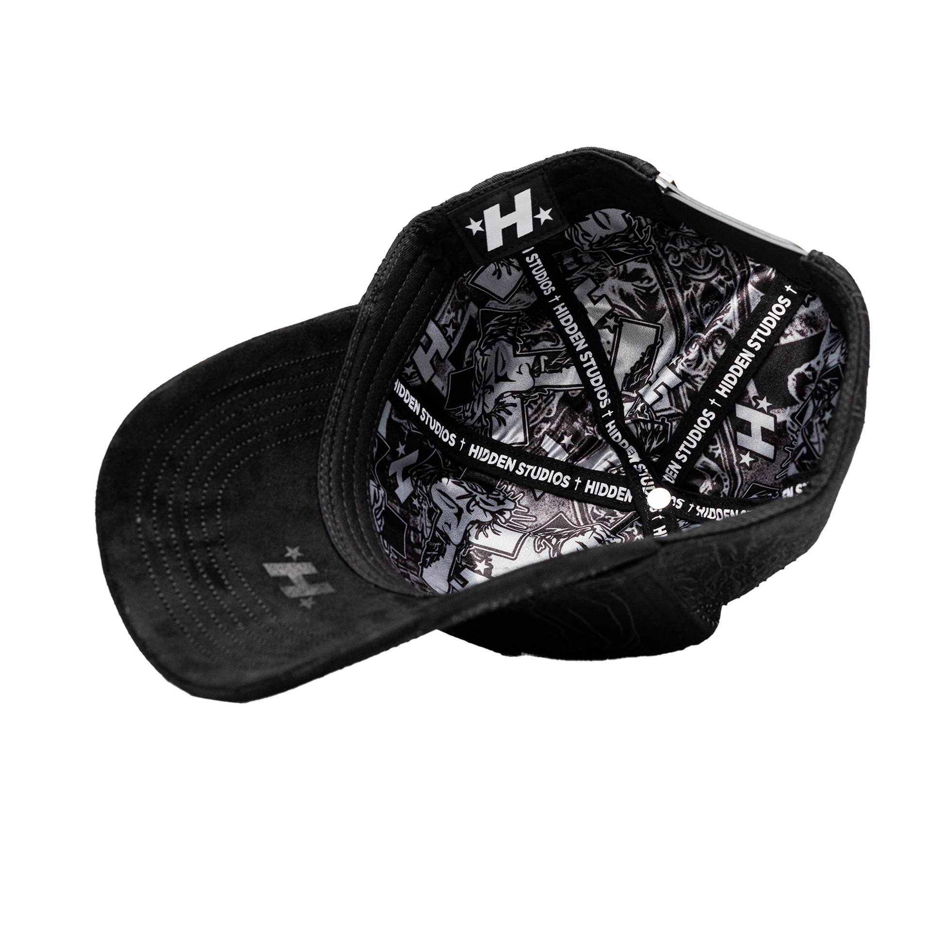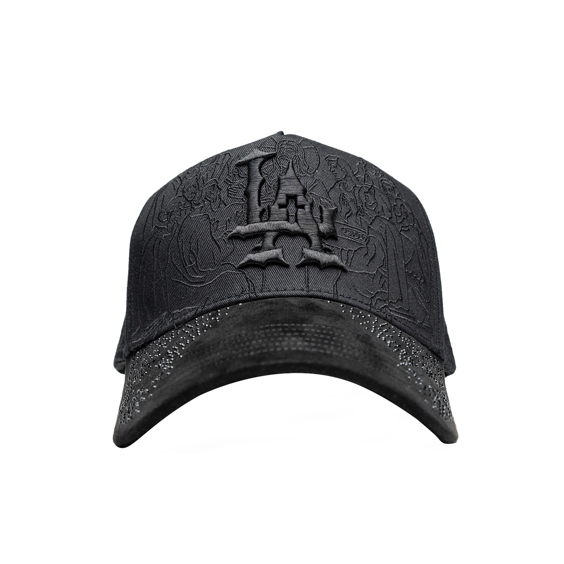 Details: Black in color, gemstones, 3D embroidery, black under visor, black sweatbands